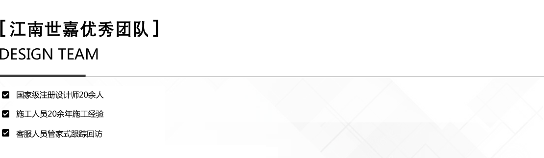 “江南世嘉”屬于江南世嘉裝飾公司獨(dú)有品牌,所有基礎(chǔ)工程施工人員均為公司工作人員,工程絕不轉(zhuǎn)包分包,如有發(fā)現(xiàn)賠付全額工程款,歡迎監(jiān)督。
